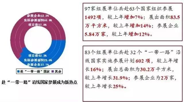 2016年全国97家组展单位共赴63个国家组织参展1492项,较上年增长7%;展出面积为83.5万平方米,增长14%;参展企业数为5.84万家,增长12%。